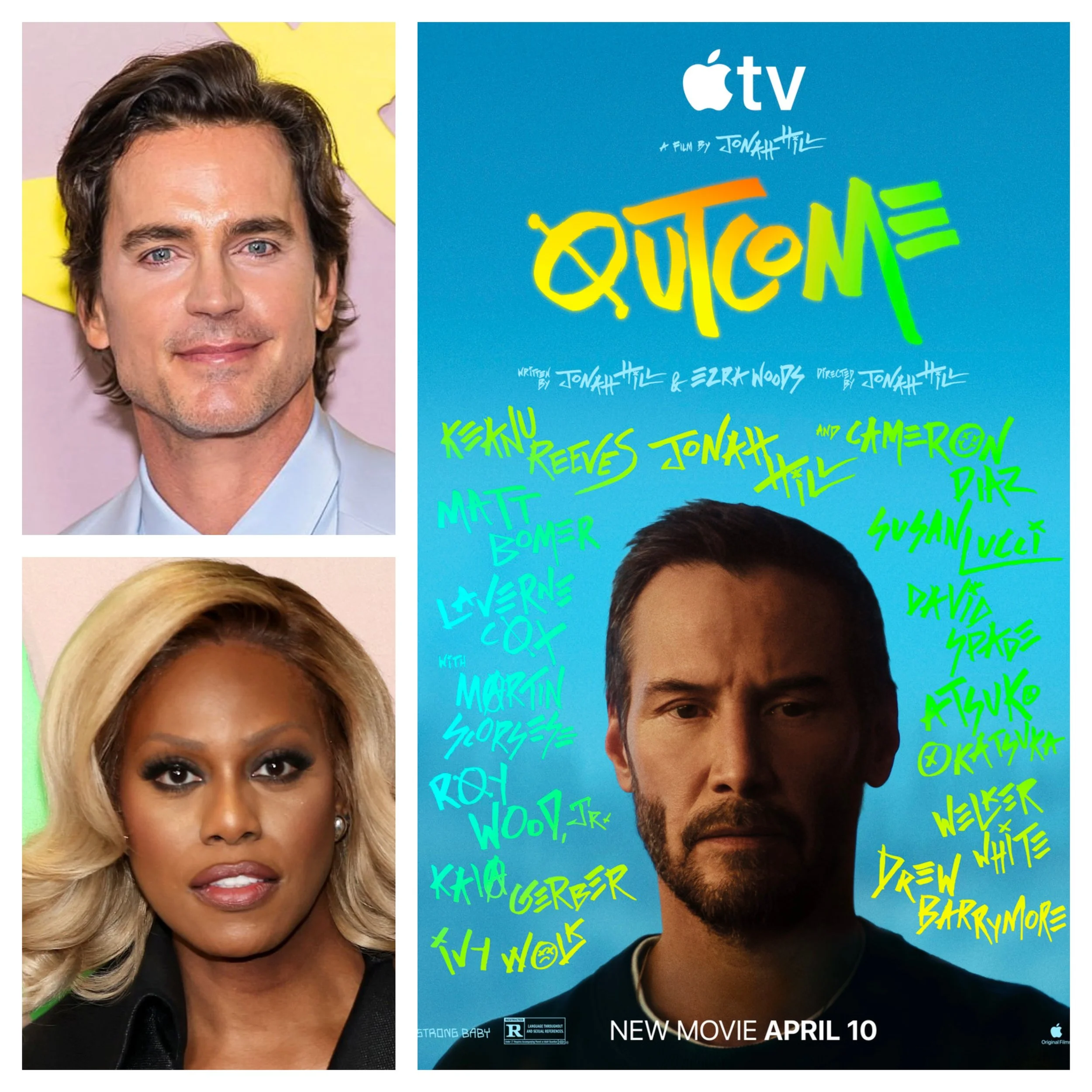 Premiering April 10 on Apple TV+ is Outcome, directed by Jonah Hill who also stars in it and co-wrote it, the cast includes Keanu Reeves, Cameron Diaz, Matt Bomer, David Spade, Kaia Gerber, Roy Wood Jr., Laverne Cox, Drew Barrymore, and Martin Scorsese.